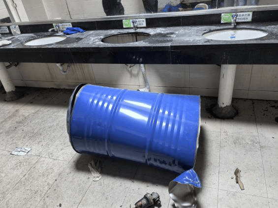 包装桶位于洗手间洗手台正前方,洗手台第3个洗手盆破碎损坏,包装桶桶底凸出,桶身上部变形,顶盖部分凸出折弯变形,部分已脱离桶身飞出,顶盖飞出部分表面贴有“醋酸正丙酯”“易燃液体”安全标签,标记显示桶内原物料净重180千克。