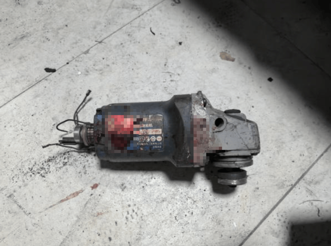 一台角磨机位于包装桶靠卫生间门口一侧,其外壳已破损且表面沾有血迹,电源线断裂脱落。